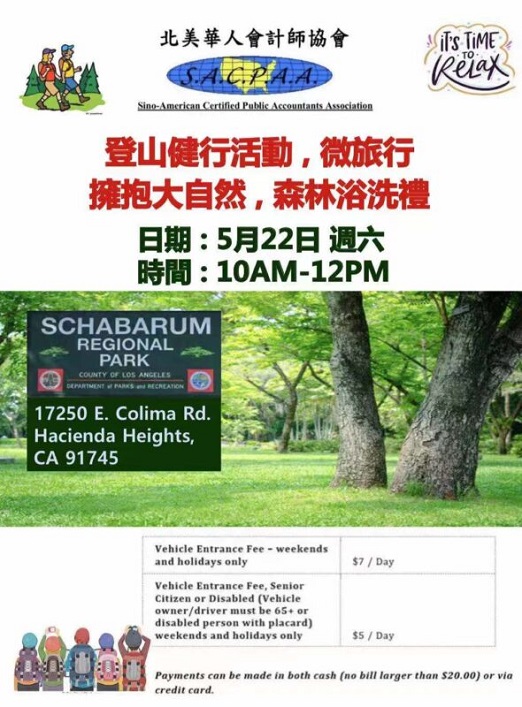 北美华人会计师协会圆满举办登山健行活动城市新闻5月22日洛杉矶报道,北美华人会计师协会圆满举办登山健行活动,会长张青会计师挂帅,统筹此次登山健行活动,带给税季后的会计师们一个舒身健体,恢复活力的周末。 张青会长表示,会计师刚刚经历了一个历史上最艰难的税季, 除了专业知识需要交流学习以外,必须要有一个好的身体,来应对下一个报税季的压力。在始终重视严格防疫的前提下,除了施打疫苗以外,呼吁大家慢慢可以走出户外,强身健体,可以从增强自身抵抗力和免疫力方面来抵御病毒的侵袭。本次活动特别感谢协会理事华兴保险张国兴总裁为本次健行活动提供饮料和脆皮蛋糕;协会法律顾问尤信砚(Tony Yu)律师、会计师赞助本次活动公园内的停车费用。